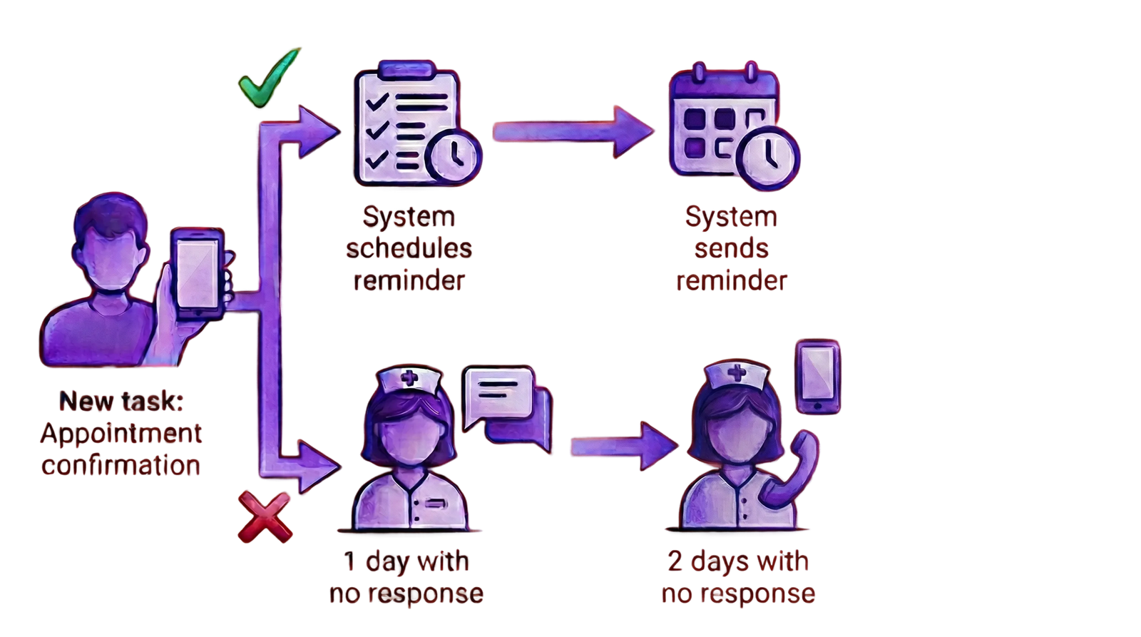 The end-to-end flow connects patient tasks, nurse chat, and escalation paths so teams can follow a single journey from first contact through resolution.