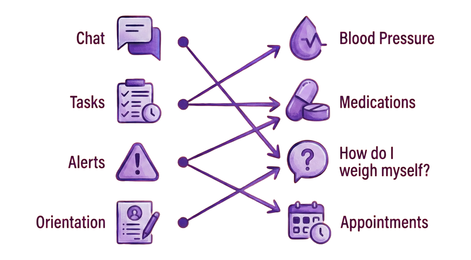 To support different monitoring needs, individual flows were defined for each health indicator, combining the most appropriate communication channels and content types. Together, these flows form a modular system structure that allows monitoring logic, frequency, and responses to adapt to each indicator’s context.